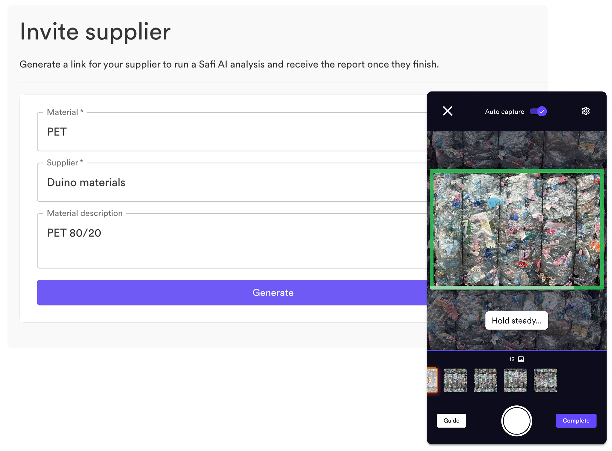 To get a quick quote, simply take a photo of the large side of 3-5 different bales on your site to receive the best possible price for your material with Safi's AI-powered buyer and seller matching technology.